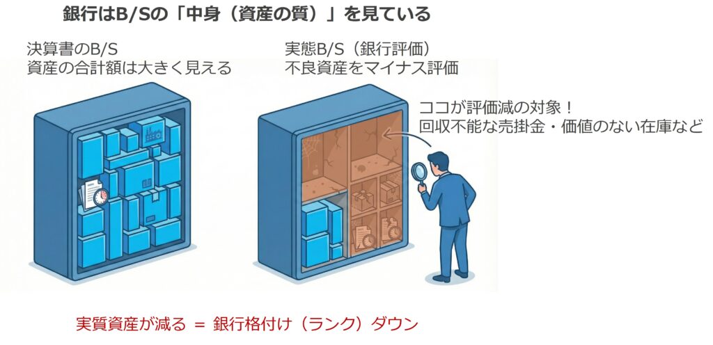 銀行などの金融機関は、B/Sに計上されている在庫が「本当にその価値があるか」を厳しくチェックします。長期間動いていない在庫は、実質的な価値がゼロ、あるいはマイナスとみなされることがあります(実態修正)。 決算書上では資産として計上されていても、銀行評価では「資産価値なし」と判断されれば、自己資本比率が実質的に低下し、銀行格付け(ランク)が下がる要因になります。これは、いざという時の融資条件や審査に悪影響を及ぼします。