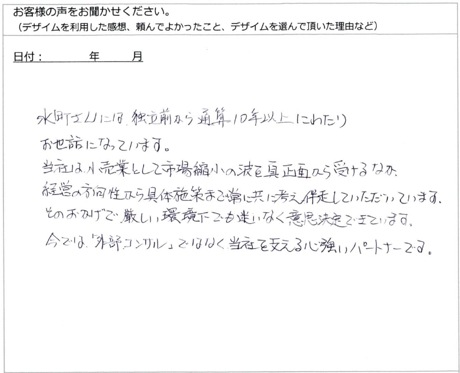 当社は小売業として市場縮小の波を真正面から受けるなか、経営の方向性から具体的な施策まで常に共に考え伴走していただいています。