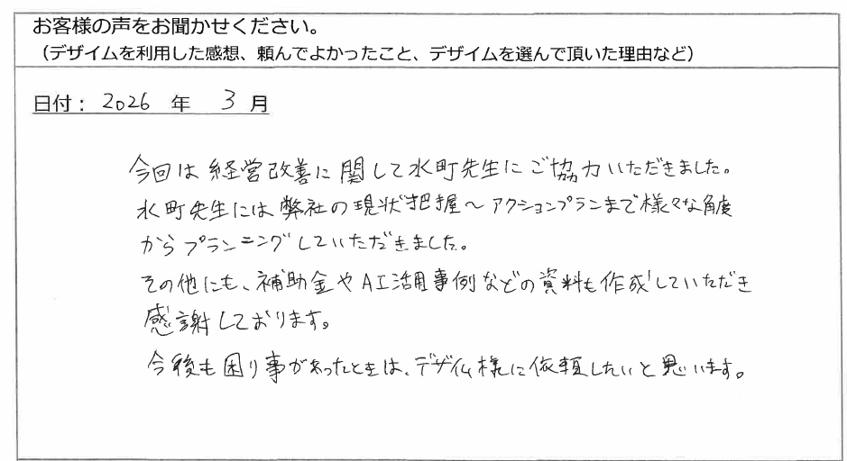 今回は経営改善に関して水町先生にご協力いただきました。水町先生には、弊社の現状把握~アクションプランまで様々な角度からプランニングしていただきました。